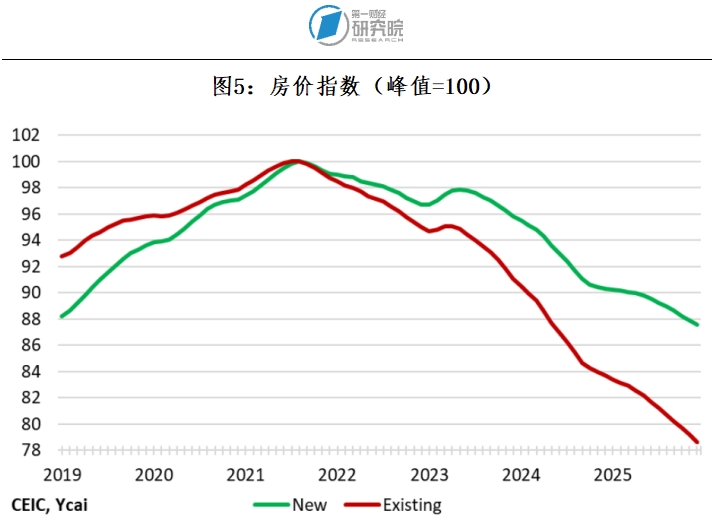 高库存给房价带来了下行压力。2025年,新建住房和二手房价格分别下跌了3%和6%。自2021年年中达到峰值以来,新建住房价格已经累计下跌12%,而二手房价格则下跌了21%(见图5)。