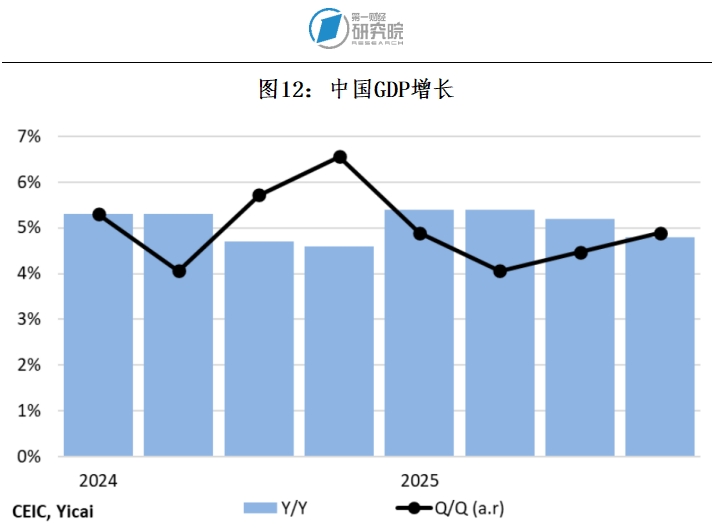 我对2026年GDP增长的预测来源于将最近几个季度的环比增长率按年化速度进行推算得出。这些数据比同比增长率更能反映当前经济的动能。过去四个季度,GDP的平均增长率为4.6%(见图12)。