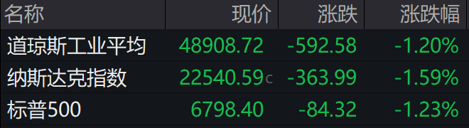 ►►当地时间周四,美国股市全线走低,截至收盘,道指跌1.20%,标普500指数跌1.23%,纳指跌1.59%。标普500指数与纳指均连续第三个交易日收跌,其中纳指本周累计跌幅接近4%。