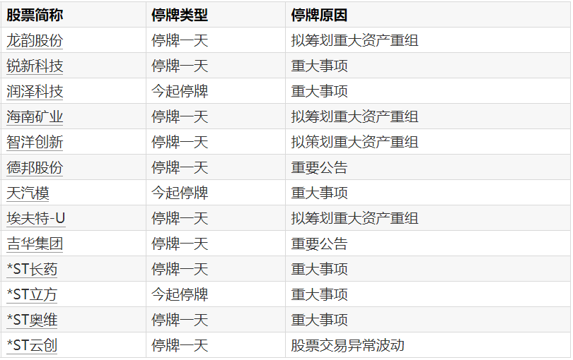 Wind数据显示,2月6日,龙韵股份、锐新科技、润泽科技等13只个股停牌。