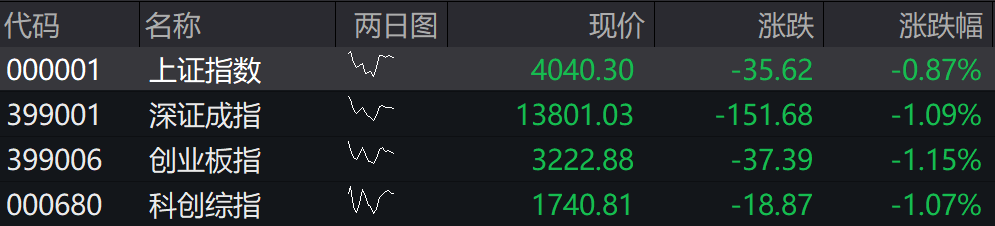 沪指低开0.87%,深成指低开1.09%,创业板指低开1.15%,科创综指低开1.07%。