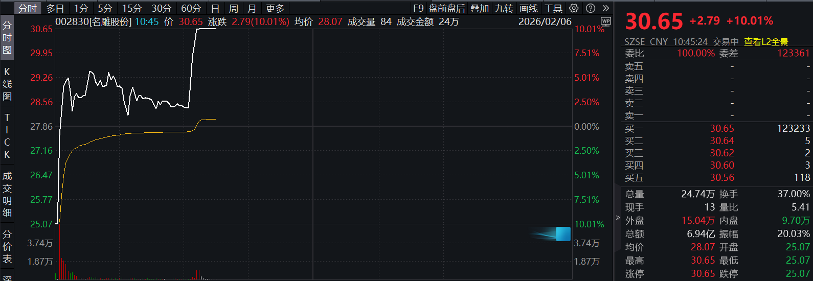 10:45 名雕股份盘中上演“地天板”,成交近7亿元,走出6天5板,该股昨日盘中走出“天地板”。