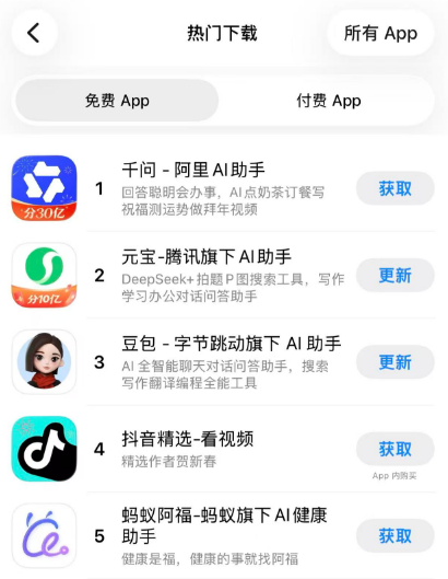 今日千问开启免单奶茶活动后,已于中午登顶苹果App Store免费应用榜。第二名为元宝,第三名为豆包。