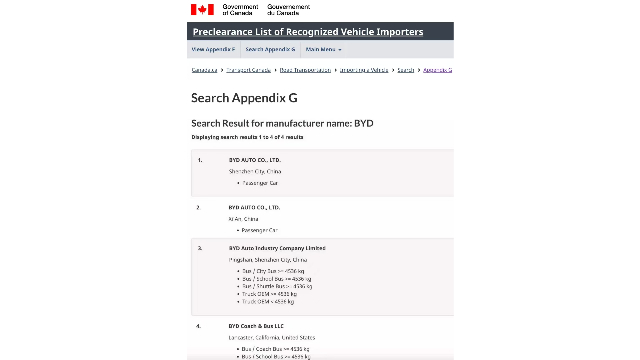 在加拿大增加关税之前,在华生产并向加拿大出口产品的电动汽车企业主要是特斯拉和极星。第一财经记者发现,比亚迪在深圳和西安制造的乘用车也出现在加拿大交通部的附录G预批准计划中。据加交通部,附录G允许汽车制造商进口少于2500辆的已符合加拿大机动车安全标准(CMVSS)的新型外国制造车辆,但该项目已经于去年7月起暂停申请,为期一年。目前无法得知比亚迪具体申请时间。