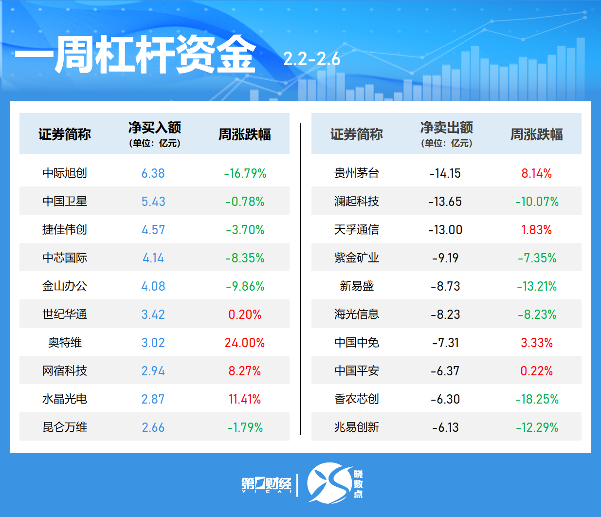 中际旭创本周获融资净买入居首,净买入额为6.38亿元,周跌16.79%。中国卫星、捷佳伟创、中芯国际获净买入额居前;贵州茅台、澜起科技、天孚通信遭净卖出额居前,金额分别为14.15亿元、13.65亿元、13.00亿元。