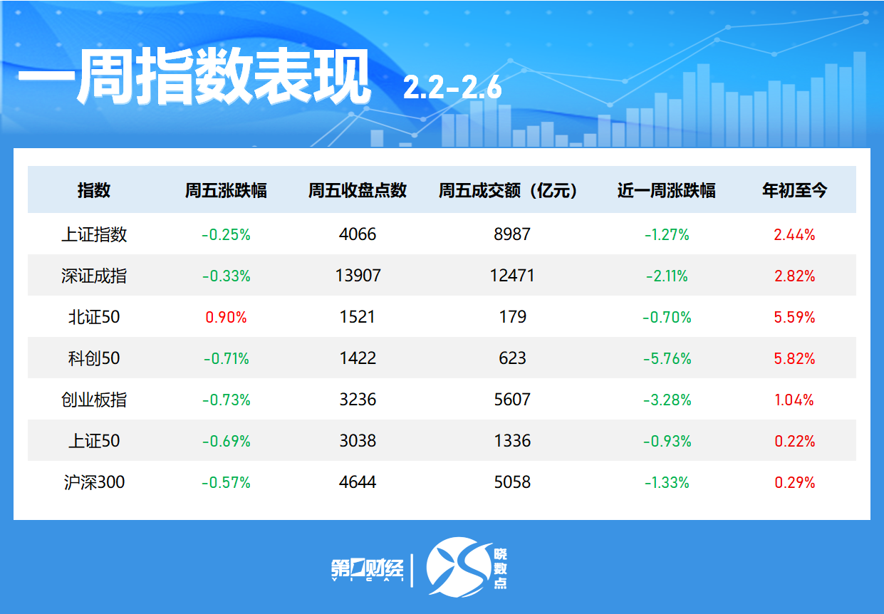 本周(2月2日至6日)三大指数齐跌,沪指累计下跌1.27%,深成指跌2.11%,创业板周跌3.28%。