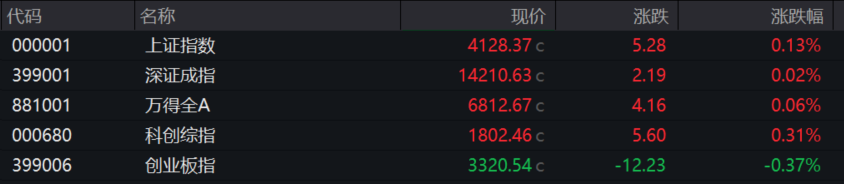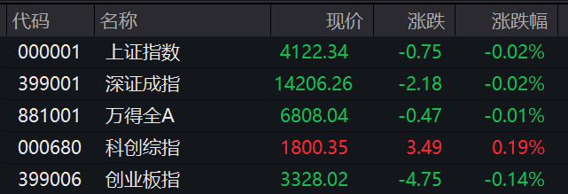 沪指跌0.02%,深成指跌0.02%,创业板指跌0.14%,科创综指涨0.19%。