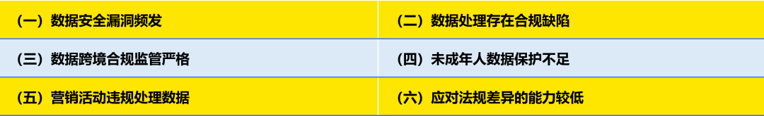 3.本白皮书从六个维度提炼企业出海过程中高频出现的数据合规风险点: