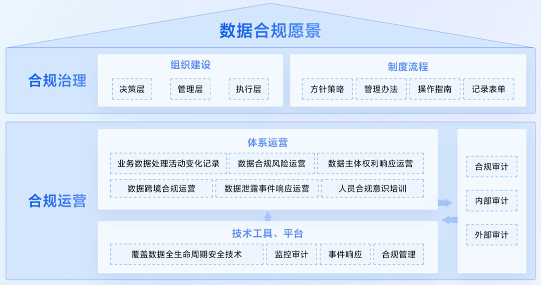为有效应对数据合规挑战,出海企业需立足业务实际,融合监管要求与行业最佳实践,从战略愿景、组织架构、制度流程、技术保障等维度,构建覆盖数据全生命周期的安全、合规、高效管理体系。本白皮书通过深度剖析头部出海企业的数据合规建设经验,系统总结方法论,形成一套科学完备、实操性强的数据合规管理体系建设方案。