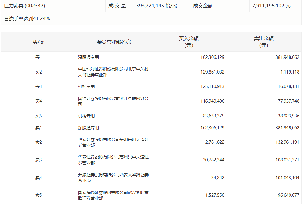 巨力索具今日涨7.94%,有2家机构专用席位净卖出2.79亿元