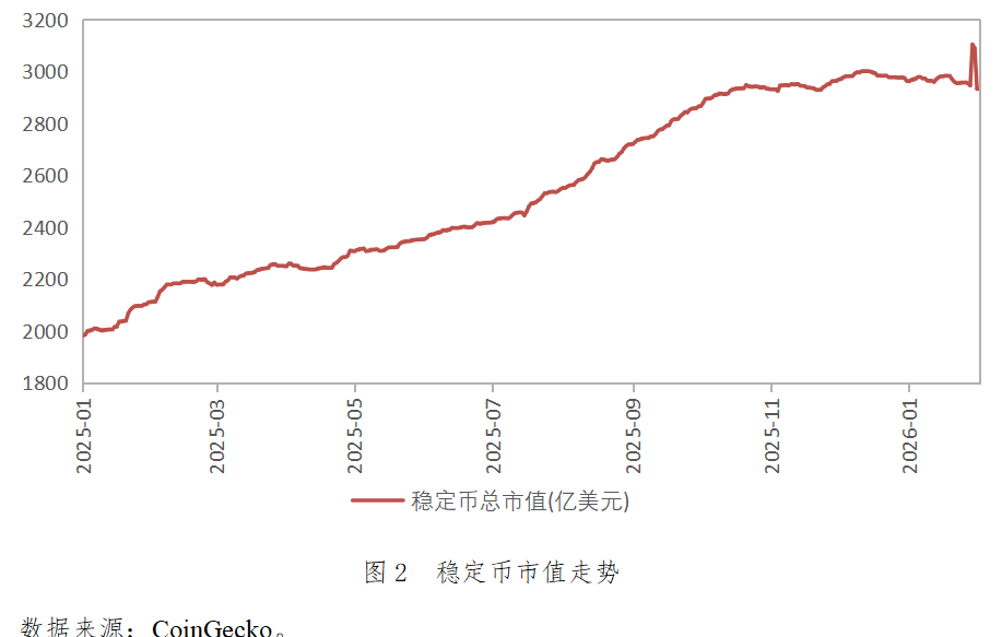 稳定币市场价值扩容放缓。根据RWA.xyz的统计,截至2026年1月31日,稳定币总市值为2932.86亿美元,较上季度末的2865.88亿美元仅增长2.3%。主要原因是加密资产总市值缩水、价格下跌,稳定币作为加密市场的流动性和交易锚,其市值支撑源自全市场容量。随着2025年四季度加密资产吸引力降低,稳定币也从2025年前三季度的快速扩容期转向了市值稳定期。