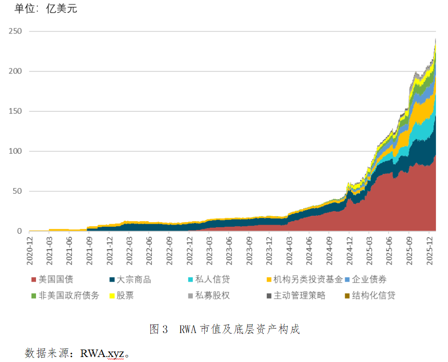 现实世界资产(RWA)市值持续增长,从2025年三季度末到2026年1月末增幅达41.1%至约237亿美元,其中美国国债RWA占比最高,为40%。国际市场上,贝莱德等传统金融机构积极推动合规产品代币化;国内RWA发展则将在突出合规与明确服务实体经济的政策导向下,围绕促进消费、与数字人民币融合、收益权与数据资产等方向展开创新。