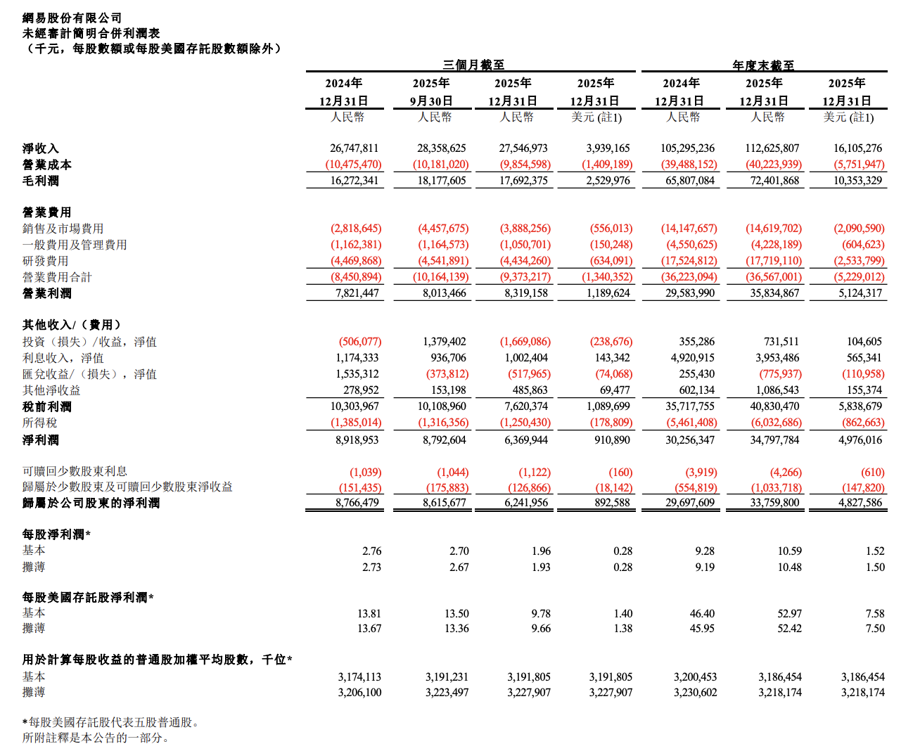 看向2025年全年,网易总营收为1126亿元,同比增长约7%;归股净利润为338亿元,同比增长13.8%。