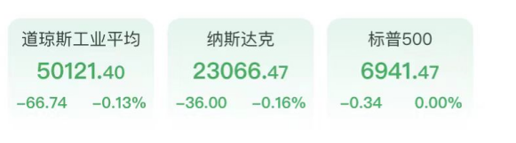 截至收盘,道指跌66.74点,跌幅0.13%,报50121.40点,纳指跌0.16%,报23066.47点,标普500指数微跌不到0.01%,报6941.47点。