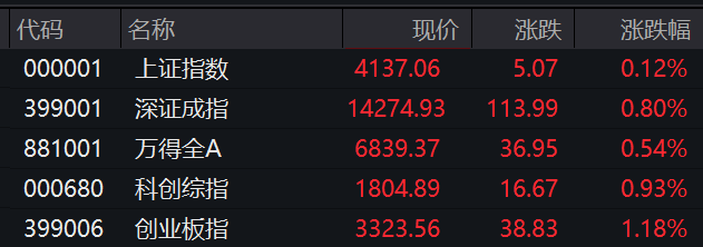 沪指涨0.12%,深成指涨0.12%,创业板指涨0.3%,科创综指涨0.43%。通信服务、液冷服务器、算力租赁板块走强,智谱AI板块表现活跃,影视院线板块走低。