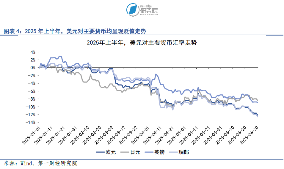 综合来看,2025年,美元指数的强势走势在美国关税政策和财政政策的共同作用下被打破,美元指数从100点位上方回落。在2025年前6个月,美元指数的累计跌幅接近10%,美元对欧元贬值12.2%,对日元贬值8.4%,对英镑贬值8.9%,对瑞士法郎贬值12.6%。