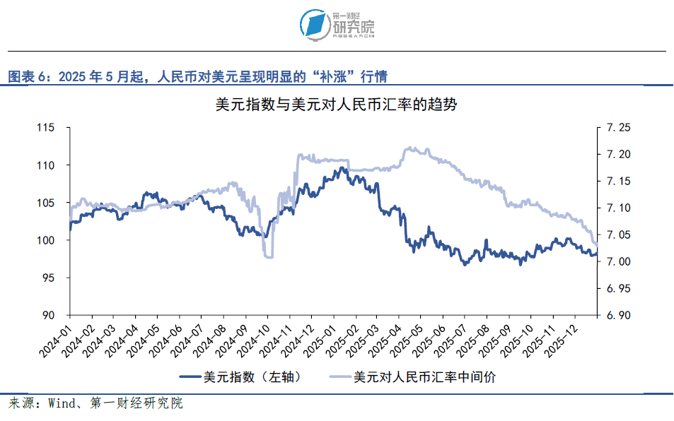 2025年,人民币对美元汇率出现明显的“补涨”行情。从时间顺序上看,美元指数在2025年上半年已经出现显著回落,但人民币对美元汇率在这一阶段并未同步升值,直到5月之后才开始出现较为明确的修复性上涨。因此,2025年人民币对美元汇率可以分为两个主要阶段:一是在1月至4月期间,人民币对美元整体呈现稳中偏弱的走势,人民币对美元中间价的均值约为7.18,人民币对美元即期汇率的均值约为7.29。二是自5月起,人民币对美元汇率呈现单边上涨趋势,人民币对美元中间价均值由7.19上升至7.06,升幅约为2%,人民币对美元即期汇率均值由7.2上升至7.04,升幅约为2.35%。