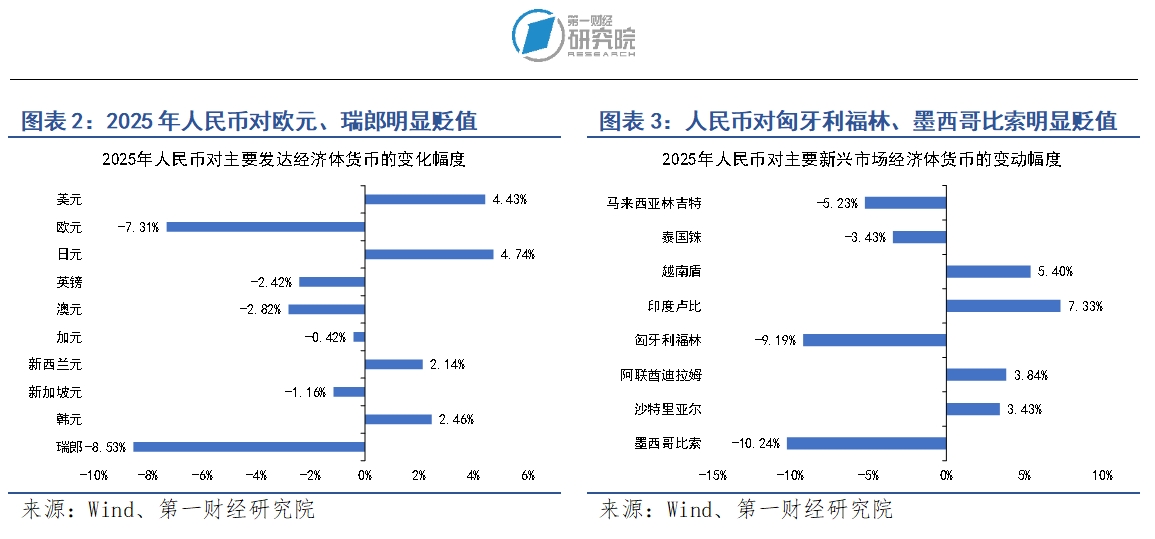 在新兴市场经济体中,2025年人民币主要对印度卢比和越南盾升值,升值幅度分别为7.3%和5.4%;人民币对墨西哥比索和匈牙利福林的贬值幅度明显,分别为10.2%和9.2%。
