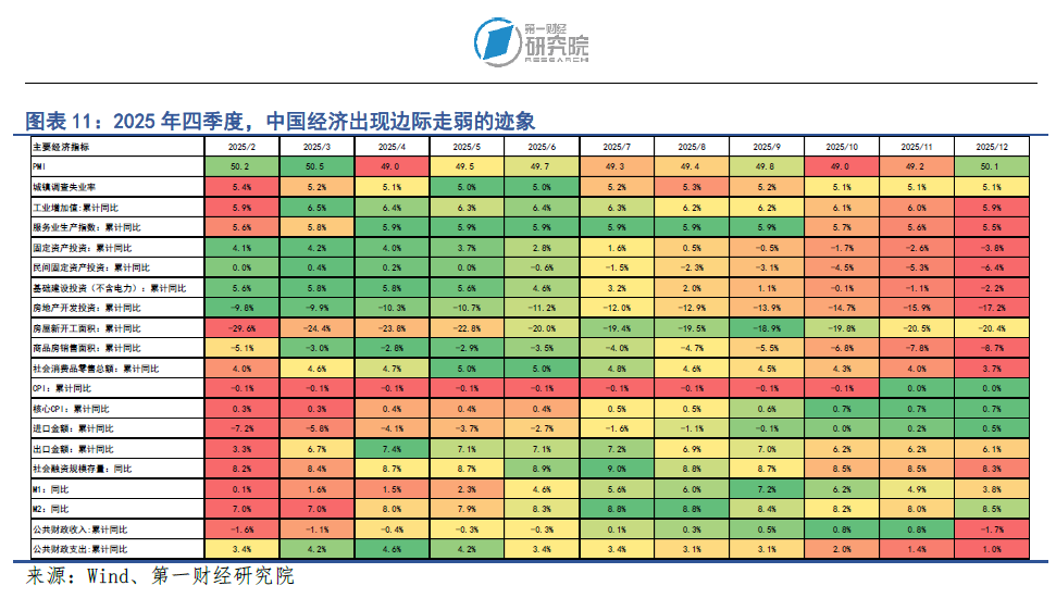值得注意的是,展望2026年,人民币汇率也存在阶段性走弱的风险。首先,中国经济基本面在2025年四季度出现边际走弱的迹象,可能带动人民币汇率下滑。虽然2025年全年完成了5%的GDP增长目标,但四季度GDP明显放缓,单季GDP增速仅为4.5%,为三年来最低的单季增速。从经济结构上看,消费和投资增速同步下滑,2025年12月当月社会消费品零售总额增速仅为0.9%,房地产开发投资全年下降17.2%,表明居民消费和地产链条尚未企稳。此外,2025年中国外贸表现强劲,一定程度上是出口商在当下关税谈判阶段进行“抢出口”的活动,2026年中国外贸表现的动能同样有走弱的风险。