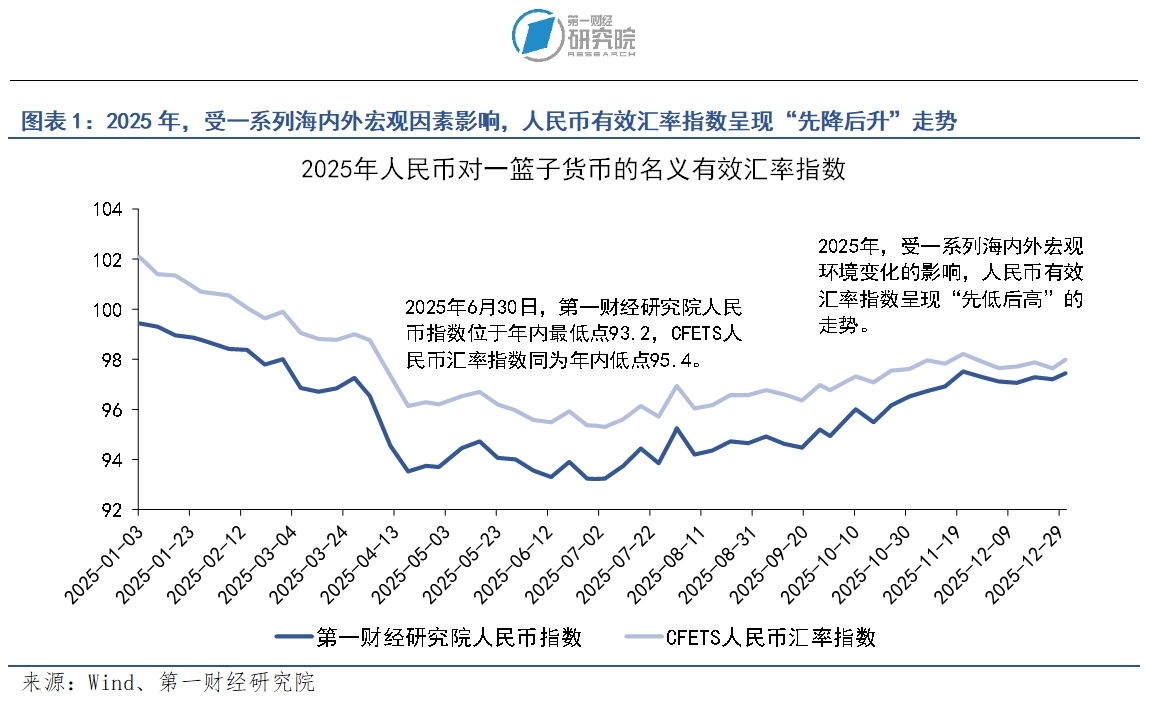 在错综复杂的宏观背景下,人民币表现出较强的韧性,2025年人民币有效汇率指数随宏观环境变化呈现出“先降后升”的走势。其中,第一财经研究院人民币有效汇率指数由2025年年初的99.4下降至年内最低点93.2后,于年末回升至97.4;外汇交易中心发布的CFETS人民币指数由2025年年初的102.1下降至年内最低点95.3后,于年末回升至98。