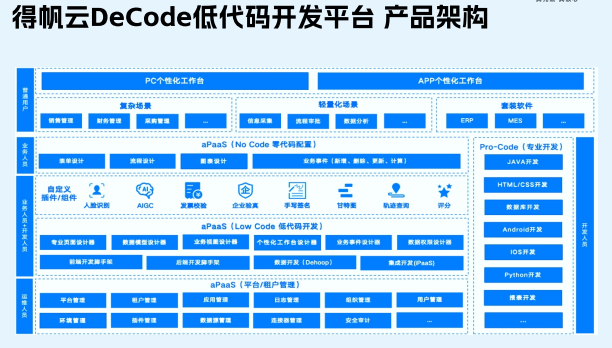 低代码行业竞争已告别单一产品比拼的初级阶段,迈入综合服务能力较量的深水区,头部厂商纷纷完善产品矩阵,以覆盖企业全流程数字化需求。得帆智能立足这一行业特征,构建了得帆云AI低代码aPaaS平台和AI融合集成iPaaS平台两大核心产品,形成应用开发与集成服务的双向支撑。