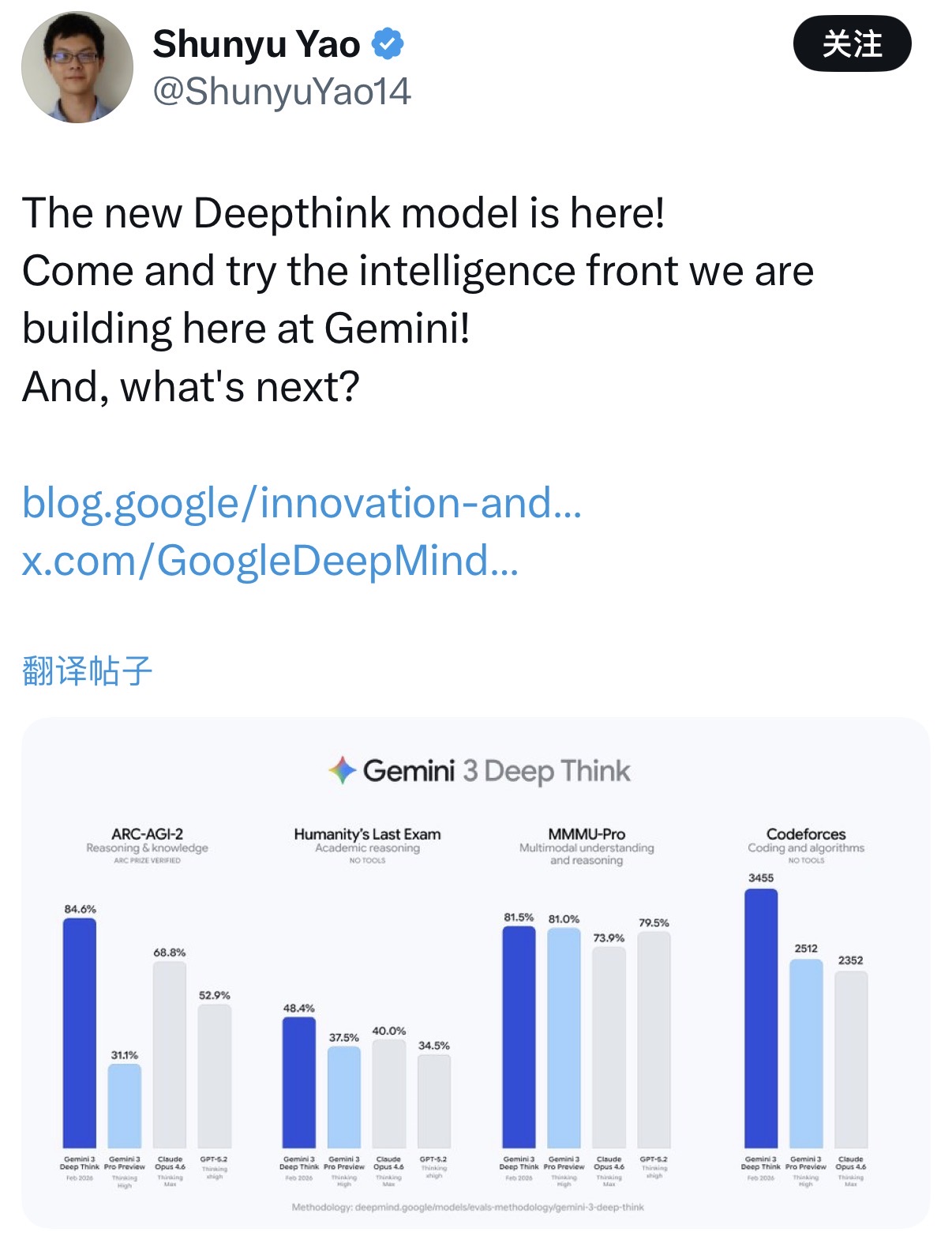 值得一提的是,去年9月加入谷歌DeepMind的清华物理系知名研究者姚顺宇(ShunyuYao)也是这次DeepThink新模型的核心参与者,他在今天发帖号召大家体验新模型。