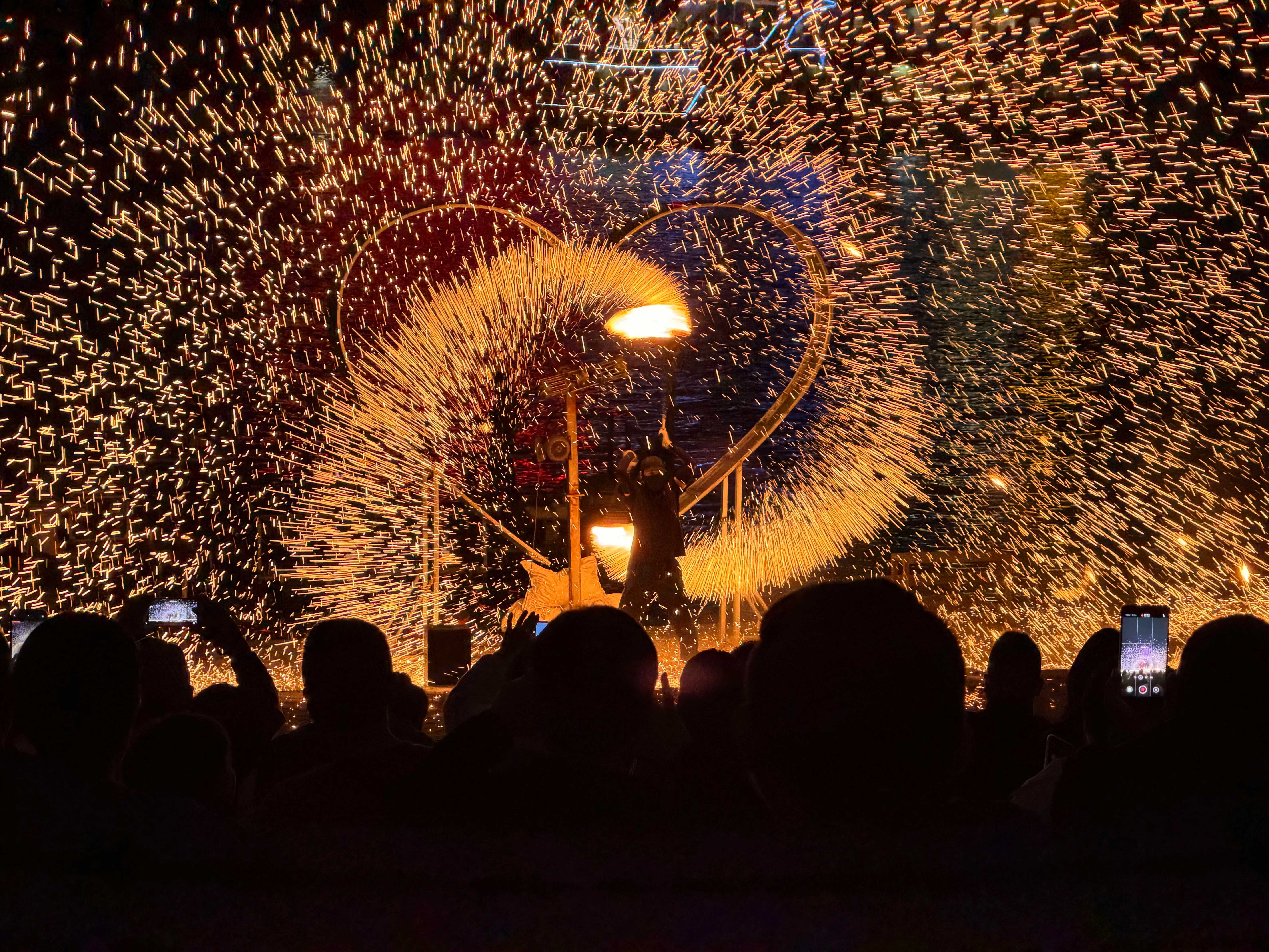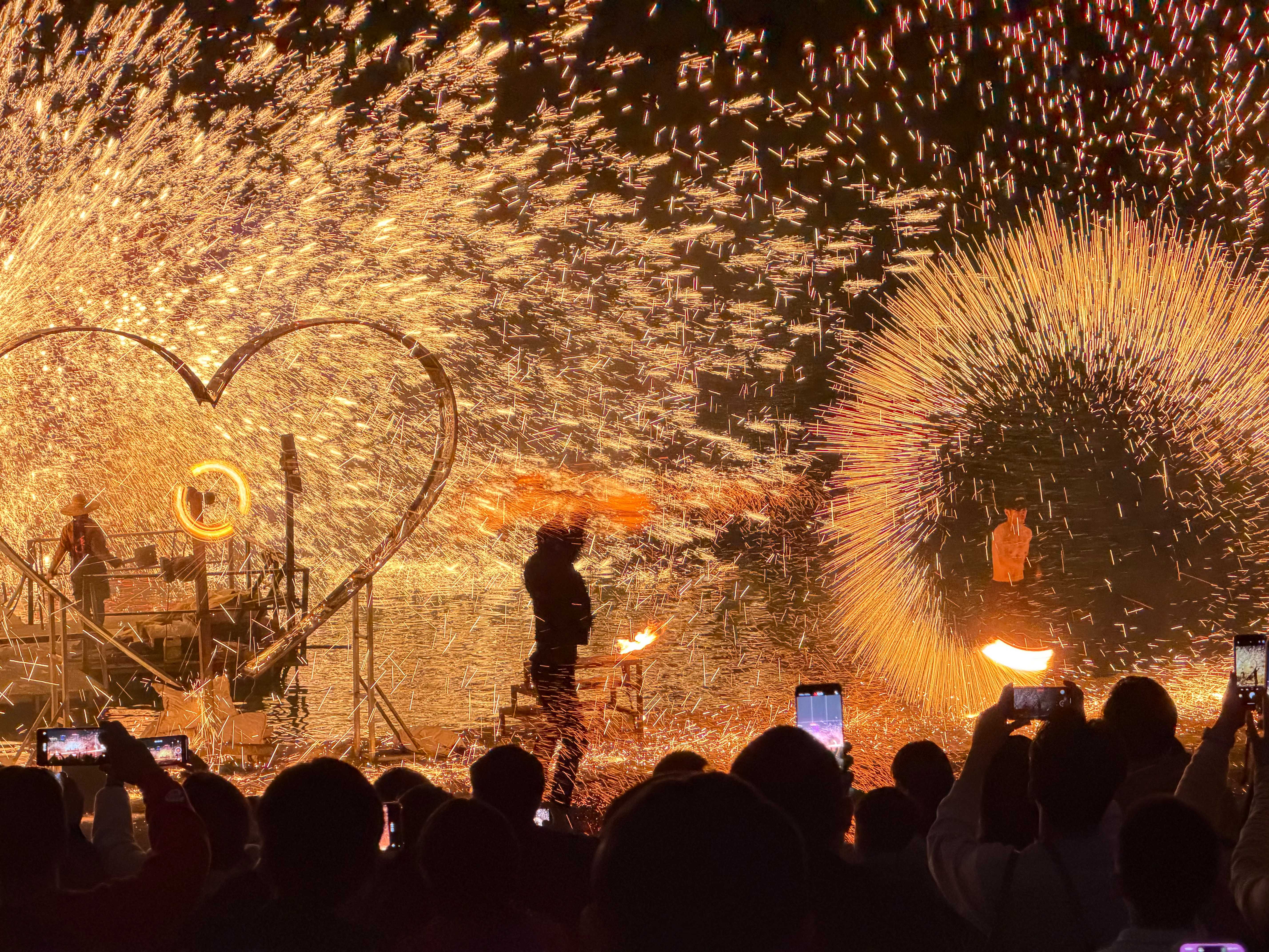 夜色下的广西南宁邕江江畔,一场打铁花的表演吸引许多观众,其中既有家庭出行的市民群体,也有游客和摄影爱好者。金红色的铁水被击打后,在空中遇冷炸裂成万点星火,形成“火树银花”的绚丽景象。