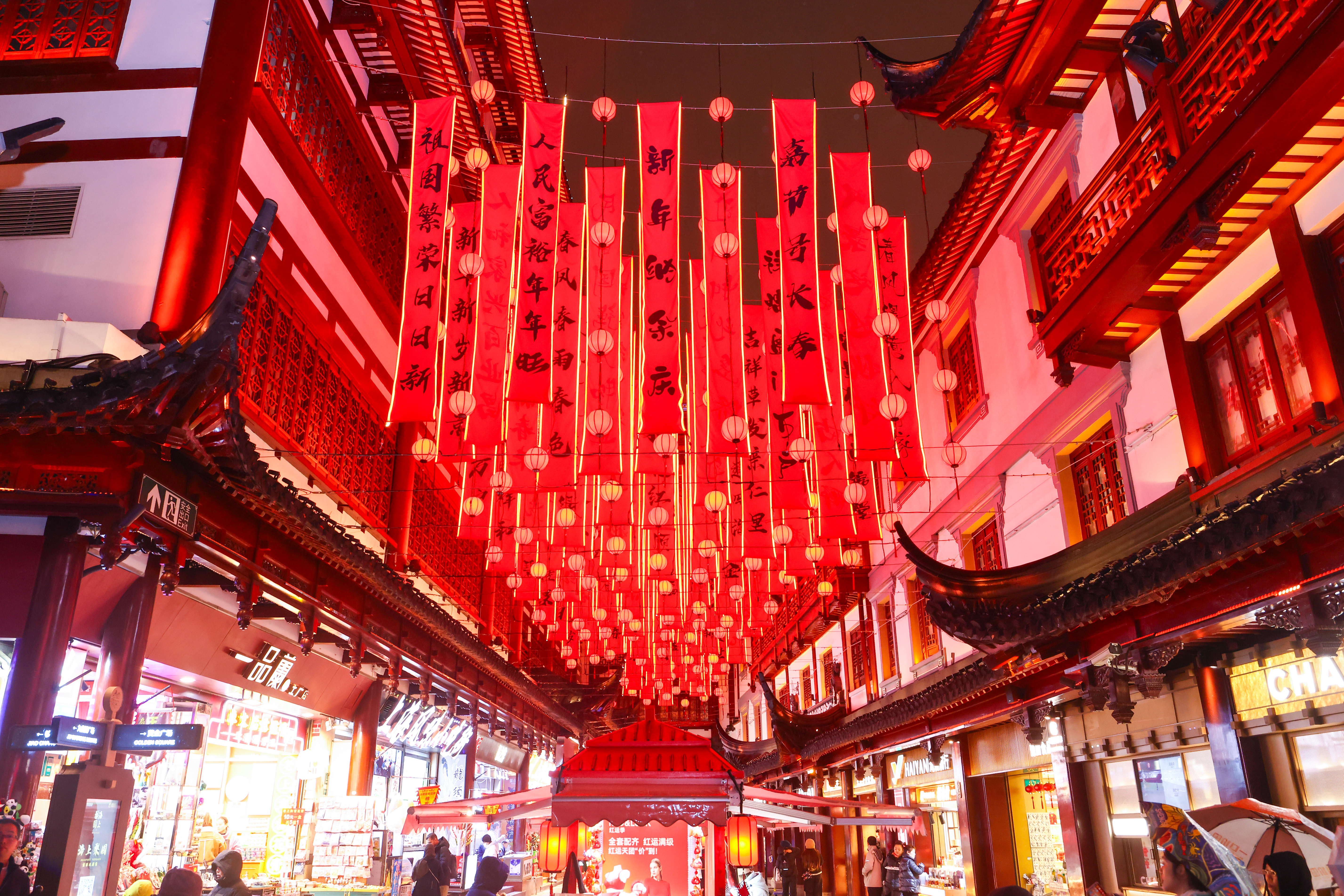 第一财经记者在豫园现场看到,马年主题的灯会流光溢彩,吸引了来自全球各地的游客,九曲桥、南翔馒头店等都排起了长队,还有不少来自海内外的游客体验汉服与旅拍。而在老庙黄金的店内,记者看到大量顾客都在咨询或购买黄金饰品,在本月,该店对于黄金饰品的克金价格有立减百元和“一口价”金饰九折等活动,以文旅结合商业联动促消费。