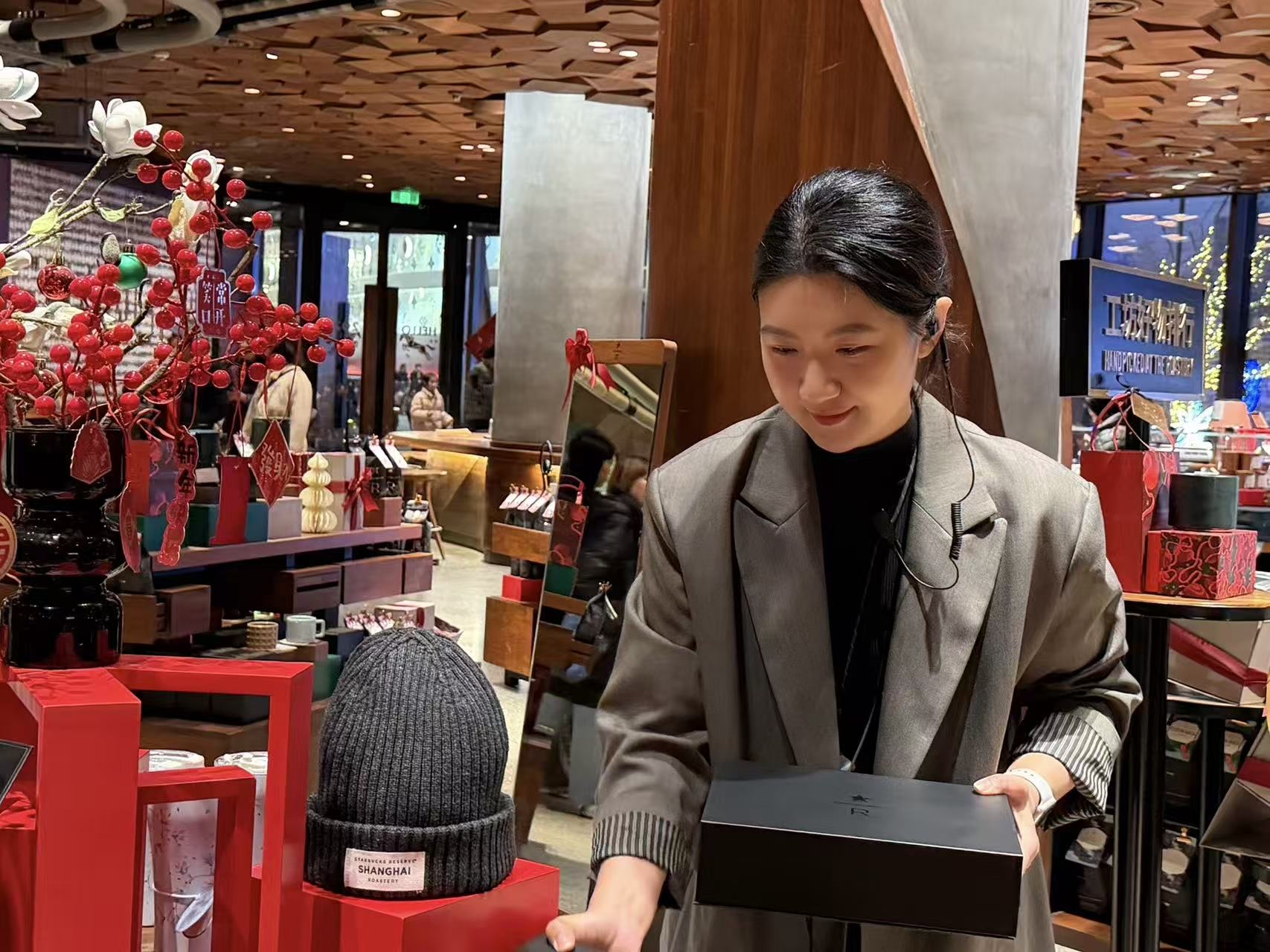 春节假期的这几天对邢婉莹来说,会有些特别安排,比如春节物料陈列、商品区域要注重年味儿和新品,此外还有新春下午茶套餐、游园会等假期专属活动。“春节入境游客增长很快,其中东南亚顾客居多,入境游客对商品的购买很热情,我们的杯子刻图案服务很受入境游客欢迎。有不少入境游客是随旅行团来的,也有因社交平台宣传来的。春节期间,韩国游客很爱来上海过年打卡。我们的伙伴有不少具有隐藏技能,比如会说法语、泰语、韩语等,可以接待来自全球的国际游客。”邢婉莹也很希望父母错峰出游来上海,她陪他们参观星巴克臻选上海烘焙工坊,来看看女儿8年来坚守的一线岗位。
