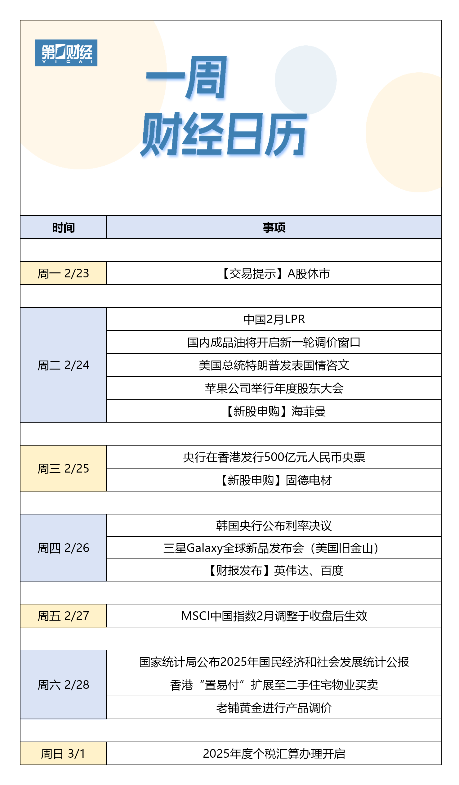 下周财经日历(2月23日-3月1日)