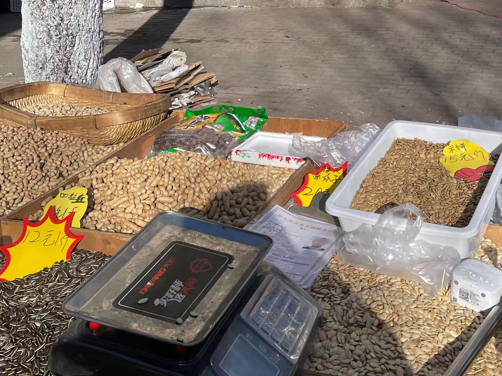 2024年2月,记者在走访红专街早市时发现,部分摊档的店家都会把一张过了塑封的“食品摊贩登记卡”别在招牌的显眼位置。卡片上有店家本人的证件照、姓名、身份证号和联系方式,还有管理单位、投诉举报电话和证件有效期。有路过巡逻的工作人员告诉第一财经记者:“百余元一斤的榛子,游客有怕少秤或劣质的担忧,很正常。摊位人证对上号,就不怕找不到。哪怕联系不上摊主,也能联系我们。”