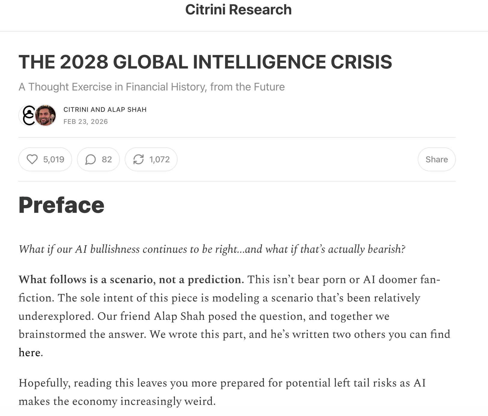 近日,一份名为《2028年全球智能危机》(The 2028 Global Intelligence Crisis)的报告在外网刷屏了,值得一提的是,这是一个预言式的推演报告,发布者也只是小型机构Citrini Research,团队在报告中推演了AI在2028年可能带来的经济危机,但这预言精准击中了市场的敏感神经,一度引发美股情绪恐慌与下跌。