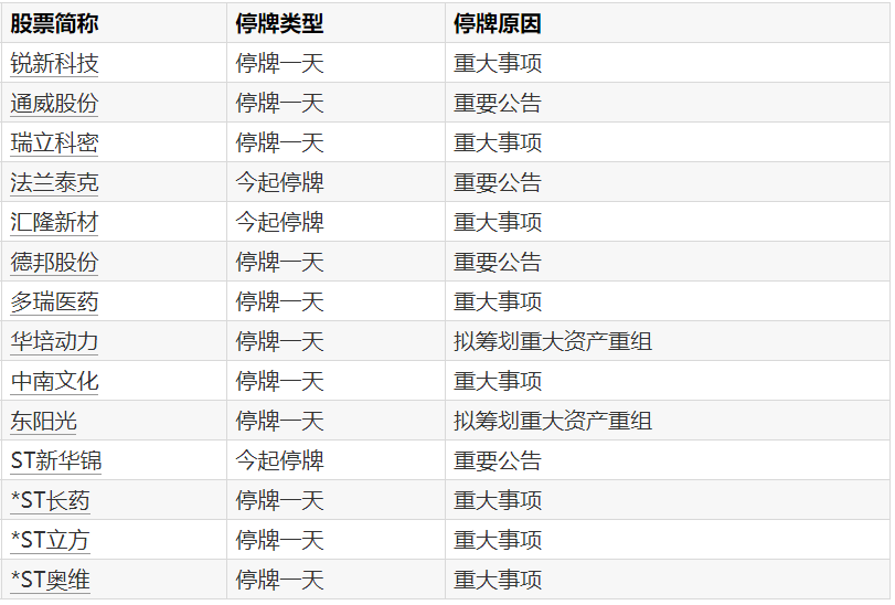 Wind数据显示,2月26日,锐新科技、通威股份、瑞立科密等14只个股停牌。