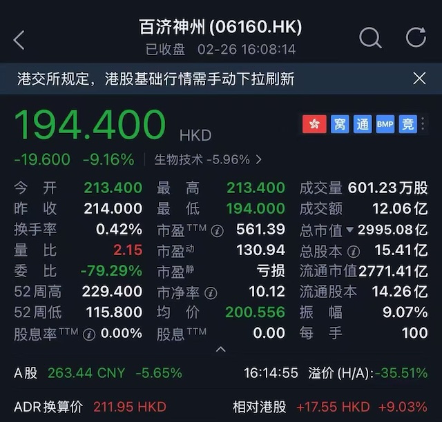 伴随着股价大跌,百济神州2月26日在港股市场的市值跌破3000亿港元,最后报2995亿港元。