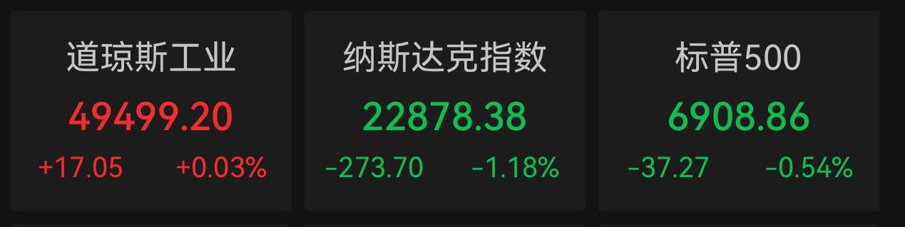 截至收盘,道琼斯工业指数上涨17.05点,涨幅0.03%,报49499.20点;标普500指数下跌37.27点,跌幅0.54%,报6908.86点;纳斯达克综合指数下跌273.69点,跌幅1.18%,报22878.38点。道指在本月累计涨幅已达1.24%,有望实现连续10个月上涨。道指上一次连续10个月上涨还要追溯到2018年1月。