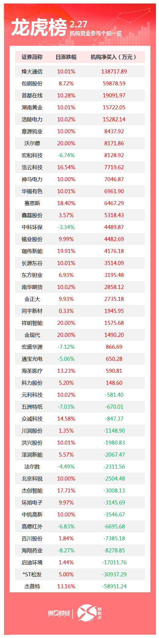 盘后数据显示,2月27日龙虎榜中,共44只个股出现了机构的身影,有27只股票呈现机构净买入,17只股票呈现机构净卖出。