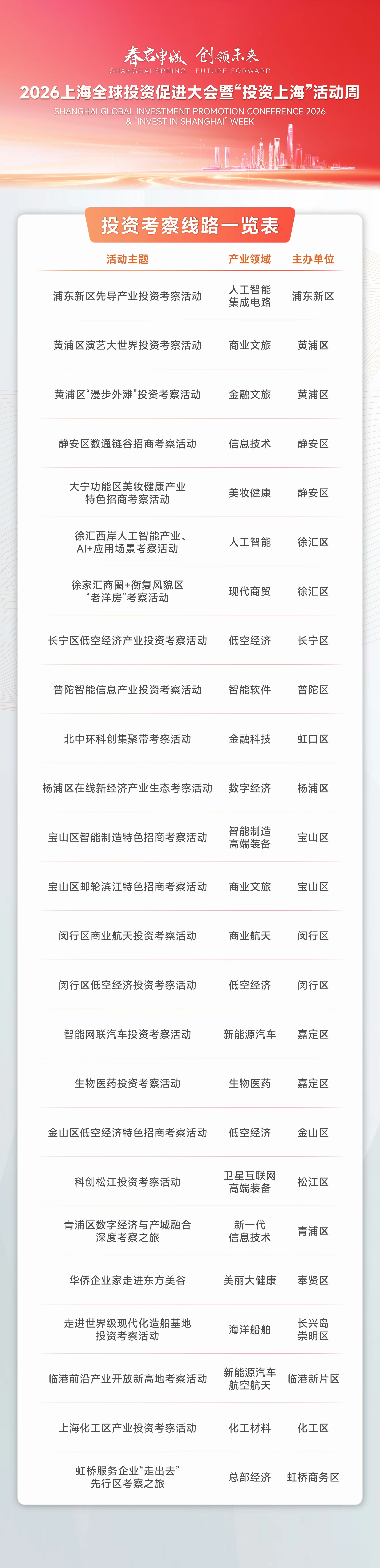 包括开展产业生态招商,组织20场重点产业推介,如宝山智能制造产业生态推介会、临港智能网联新能源汽车产融对接会等。同时,推出20多条特色考察路线,如浦东先导产业、徐汇人工智能、闵行商业航天等,让参会者深入产业园区、龙头企业实地考察。强化产融对接,聚焦金融赋能实体经济,举办投融资高峰论坛、产业并购峰会、银行赋能新质生产力论坛等活动。此外,还将发挥东方枢纽开放优势,举办全球招商合作伙伴座谈会、海外企业回访活动,进一步深化全球合作,扩大投资上海“朋友圈”。
