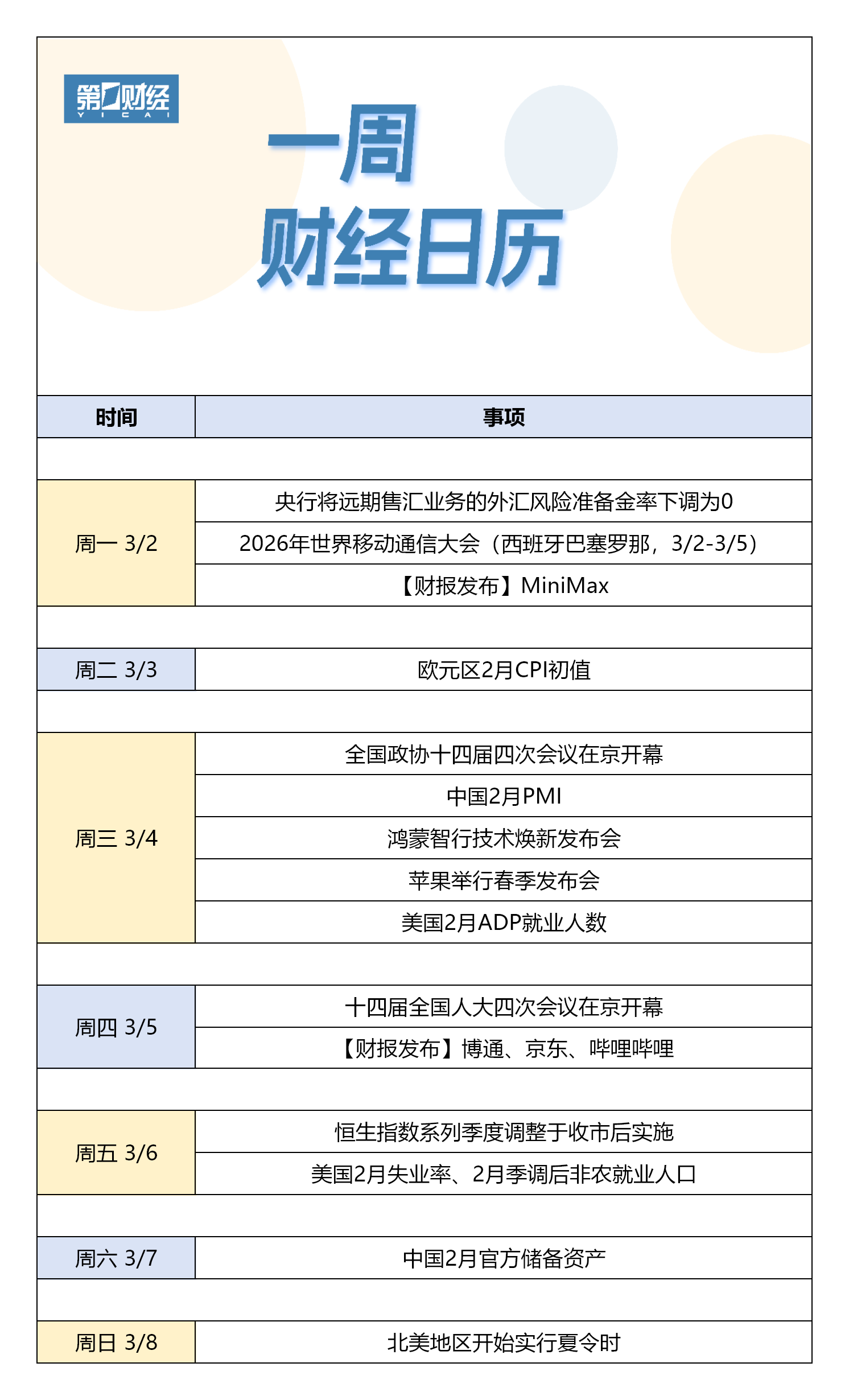 下周财经日历(3月2日-3月8日)