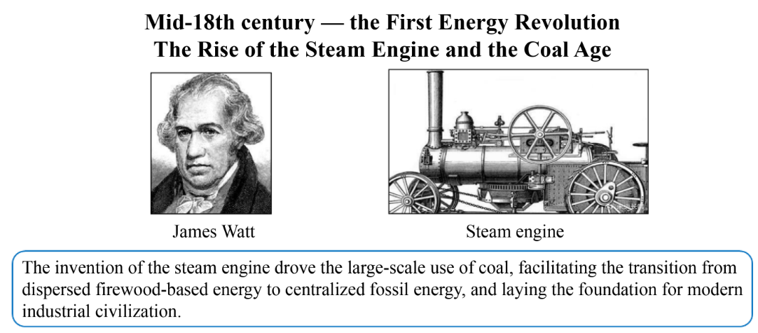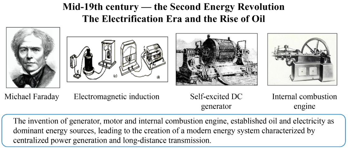 理解当下正在发生的能源革命,需要我们从人类能源演进的历史维度进行审视,第一次能源革命,始于18世纪中叶,瓦特发明蒸汽机,实现了用机器代替手工工具劳动,推动了煤炭的大规模利用,实现了从分散的薪柴能源向相对集中的化石能源利用的转变,开启了现代工业文明。第二次能源革命,始于19世纪中叶,法拉第发现电磁感应现象,发电机、电动机等的发明及电力和内燃机技术的突破,使石油和电力成为主导能源,建立了集中发电、远距离输送的现代能源体系,使人类进入到电气化时代。