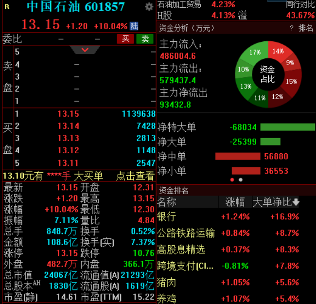 10:40 “三桶油”持续走强,中国石油连续第二个交易日涨停,股价续创11年新高,A+H股总市值超2.3万亿,中国海油盘中触及涨停,续创历史新高,A+H股总市值突破1.2万亿,中国石化大涨超8%。