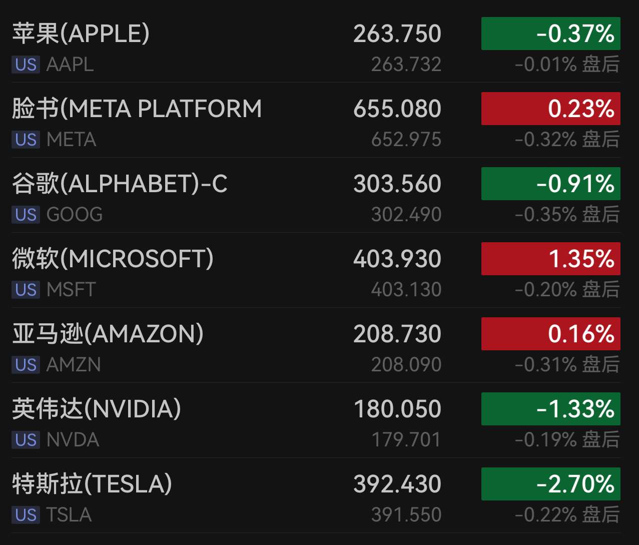 科技巨头普遍承压。英伟达跌1.33%,特斯拉跌2.70%,苹果跌0.37%,超威半导体跌3.86%,博通跌1.56%,谷歌-C跌0.91%。微软涨1.35%,亚马逊涨0.16%,Meta涨0.23%。