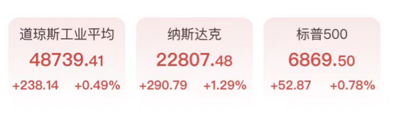 周三,华尔街主要股指全线走高。美以对伊朗军事冲突局势缓和令油价涨势回落,同时市场对美国经济增长放缓的担忧也有所消退。截至收盘,道指涨238.14点,涨幅0.49%,报48739.41点,纳指涨1.29%,报22807.48点,标普500指数涨0.78%,报6869.50点。
