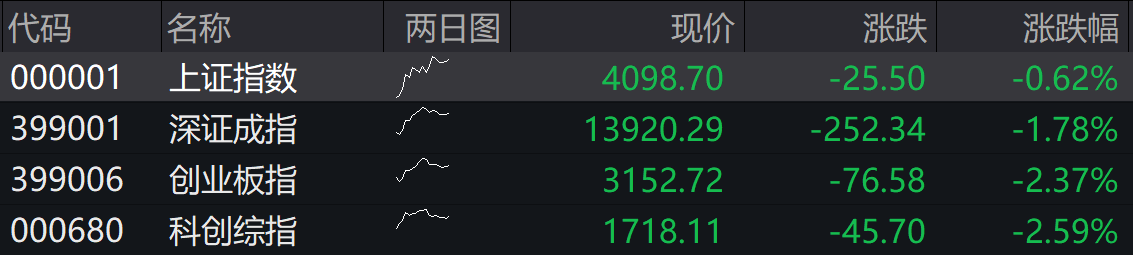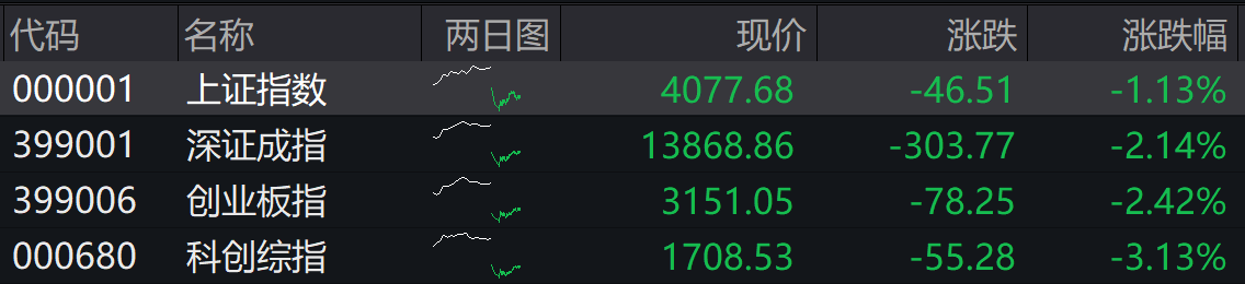 截至午盘,沪指跌1.13%,深成指跌2.14%,创业板指跌2.42%,科创综指跌3.13%。