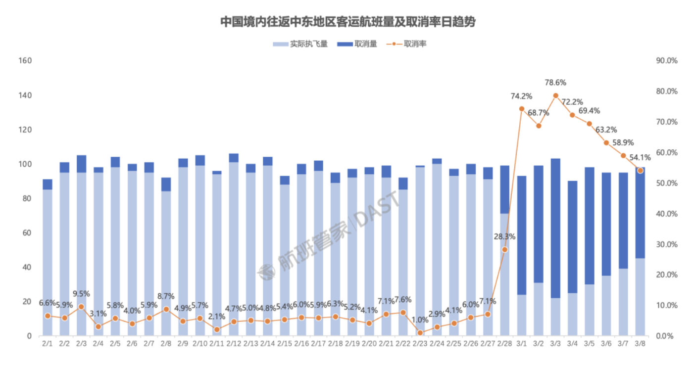 据航班管家统计,中国境内往返中东航班量自2月底航班取消率持续上升,在3月3日航班取消率达到高位,近期取消航班虽有回落,但取消率仍维持在50%以上,3月8日航班取消率达54.1%。