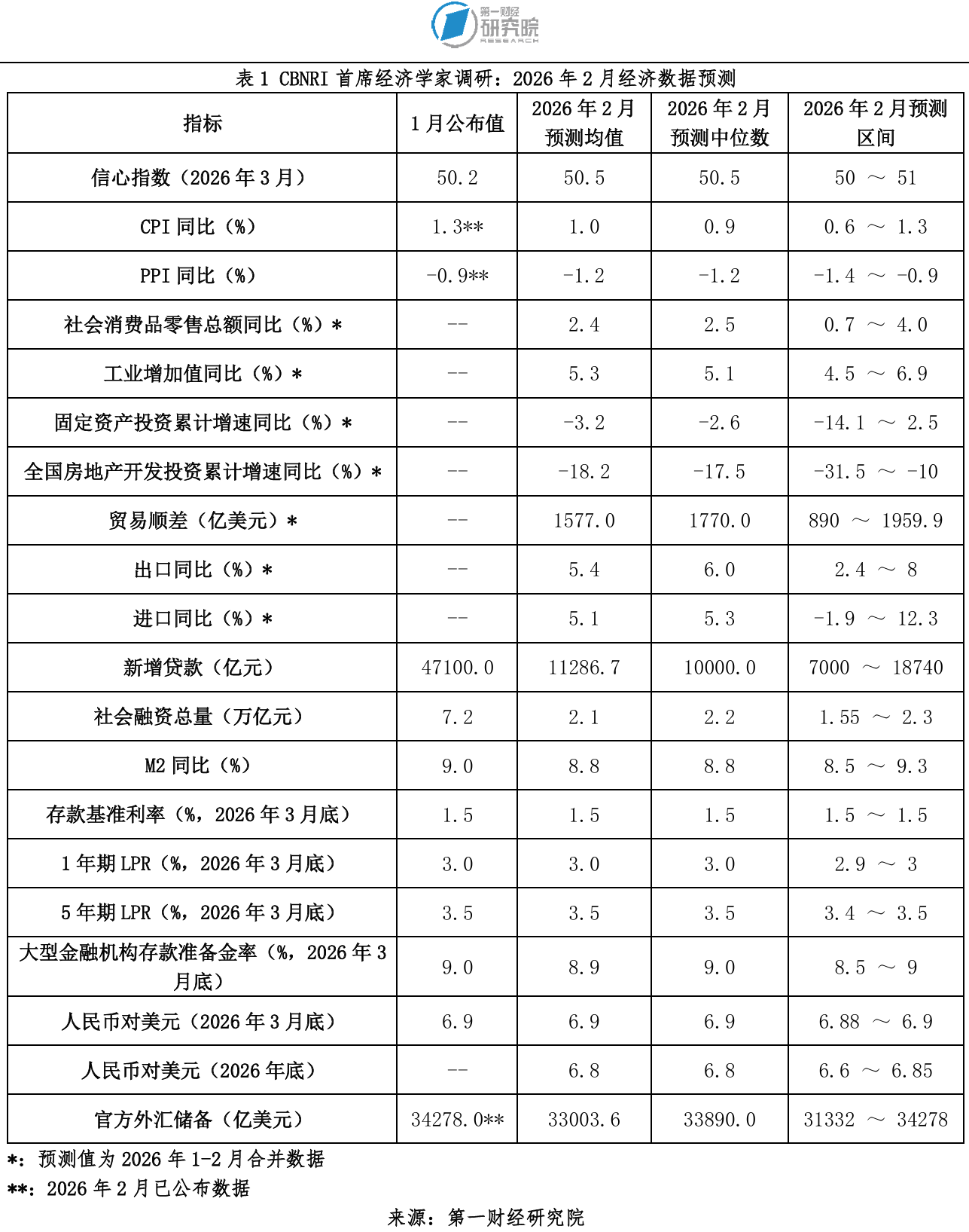 3月9日,统计局公布数据显示,受春节因素影响,2月份居民消费价格指数(CPI)同比上涨1.3%,PPI同比下降0.9%,降幅比上月收窄0.5个百分点,均高于本月经济学家们的预期。在本期调研中,首席经济学家们对2月固定资产投资累计增速预测均值为-3.2%,1~2月社会消费品零售总额同比增速预测均值为2.4%,1~2月工业增加值同比增速预测均值为5.3%;他们对1~2月贸易顺差的预测均值为1577亿美元。他们对2月新增贷款预测均值为11286.7亿元、社会融资总量预测均值为2.1万亿元,M2同比增速预测均值为8.8%。同时,他们预计未来一个月存款基准利率以及一年期和五年期LPR利率发生变化的可能性较小。