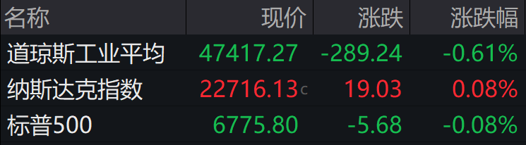 ►►当地时间周三,美国股市涨跌互现,截至收盘,道指跌0.61%,纳指涨0.08%,标普500指数微跌0.08%。