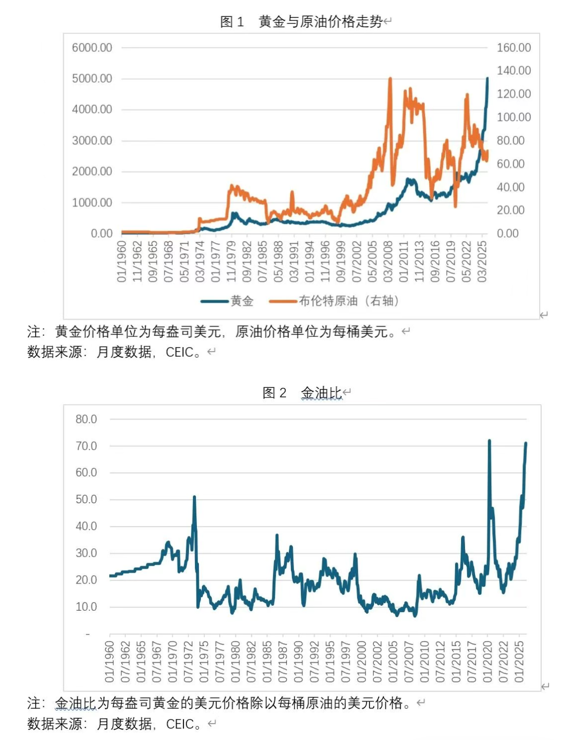 从历史演进来看,在2020年新冠疫情暴发前,金油比并未表现出随着时间推移显著上升的趋势,而是较为稳定。例如,1960年1月至2019年12月,金油比稳定在20倍上下,月度均值为18.8倍。但随着黄金价格在2020年之后显著上升,金油比大幅提升。2020年1月至2025年12月,金油比月度均值上升至32.1倍。