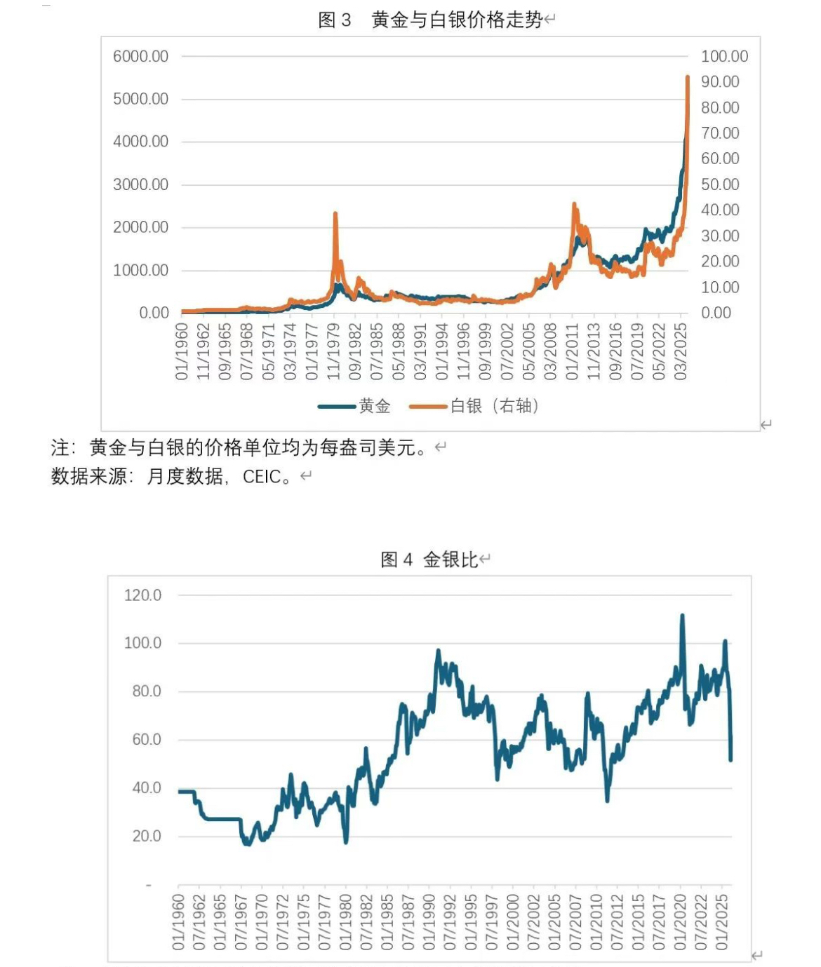 图3展示了1960年1月至2026年2月全球黄金价格与白银价格走势,图4展示了同一时期金银比变化。从图3可以看出:第一,历史上白银价格走势与黄金价格走势高度正相关;第二,在金银价格的几个周期性高点,白银价格涨跌幅度均显著超过黄金;第三,在价格触顶后,白银价格会先于黄金价格回落。从图4可看出,金银比整体上呈现出随着时间推移而上升的趋势。例如,金银比在上世纪60年代、70年代、80年代、90年代,本世纪00年代、10年代的均值分别为28.3、31.6、52.7、73.7、61.5与67.5倍。2020年至2025年,金银比均值为83.3倍。