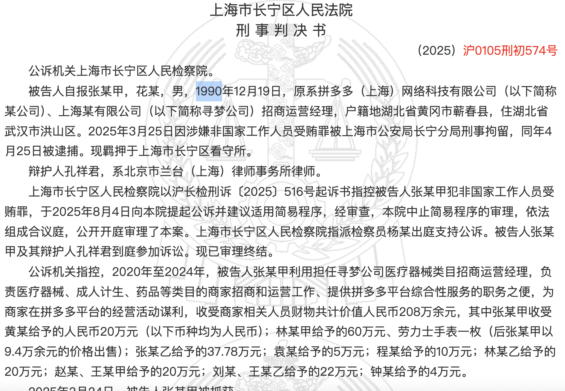 一名拼多多招商运营经理的受贿金额更是高达208万元。2月27日,上海市长宁区人民法院披露的一份文书显示,曾负责拼多多医疗器械类目的商家招商和运营工作的张某,在对接和管理医疗器械、成人计生、药品等类目的商家过程中,利用职务之便,于2020年至2024年间,先后收受商家给予的财物共计价值208万余元。收受商家贿赂的金额最低4万,最高的一笔达到了60万元及一块劳力士手表。
