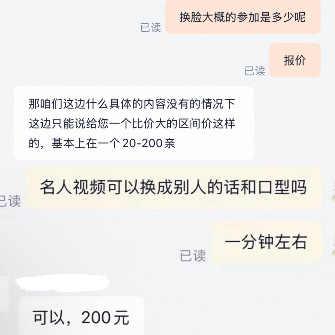 有商家粗略报价,制作换脸视频的价格在20元至200元不等。也有商家要求看完视频内容和需求进行报价,记者发送了一份2分钟的视频,询问能否换脸一位明星,在简单询问是否商用后,这位商家称500元即可制作,对于价格他解释称,由于政策限制,现在行业里真人换脸的难度较大。